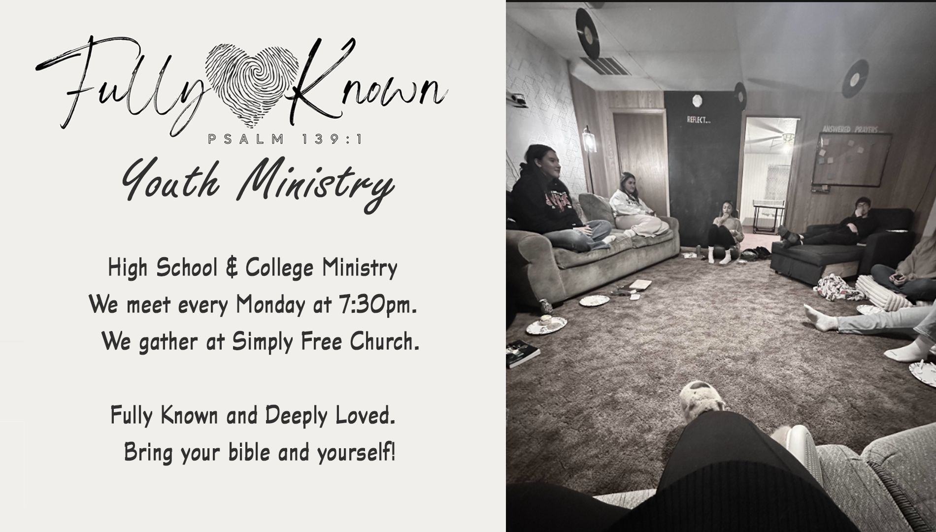 We are launching the “Fully Known” youth group for high school and older students. For more info check out their page at Fully Known Youth Ministry